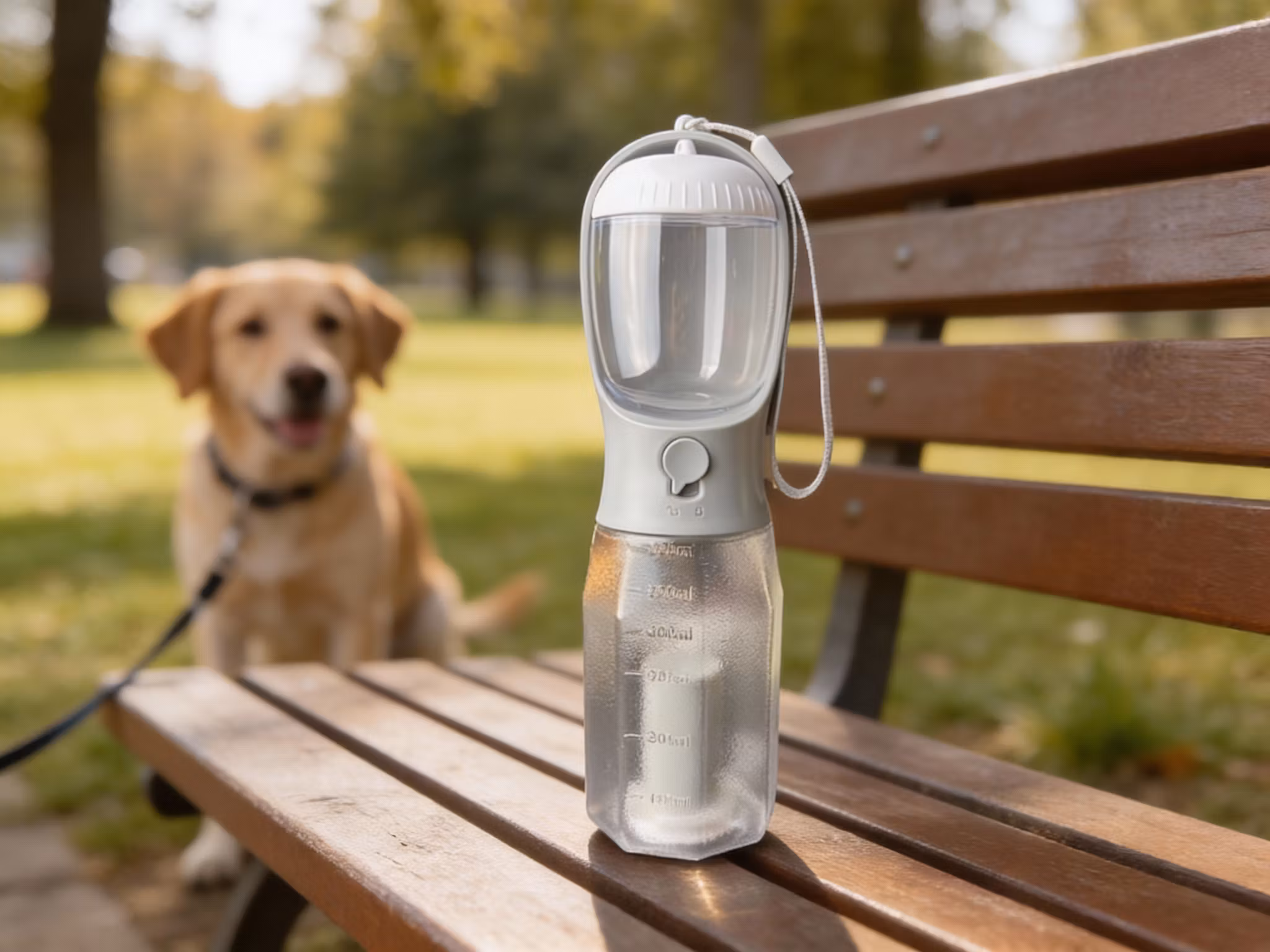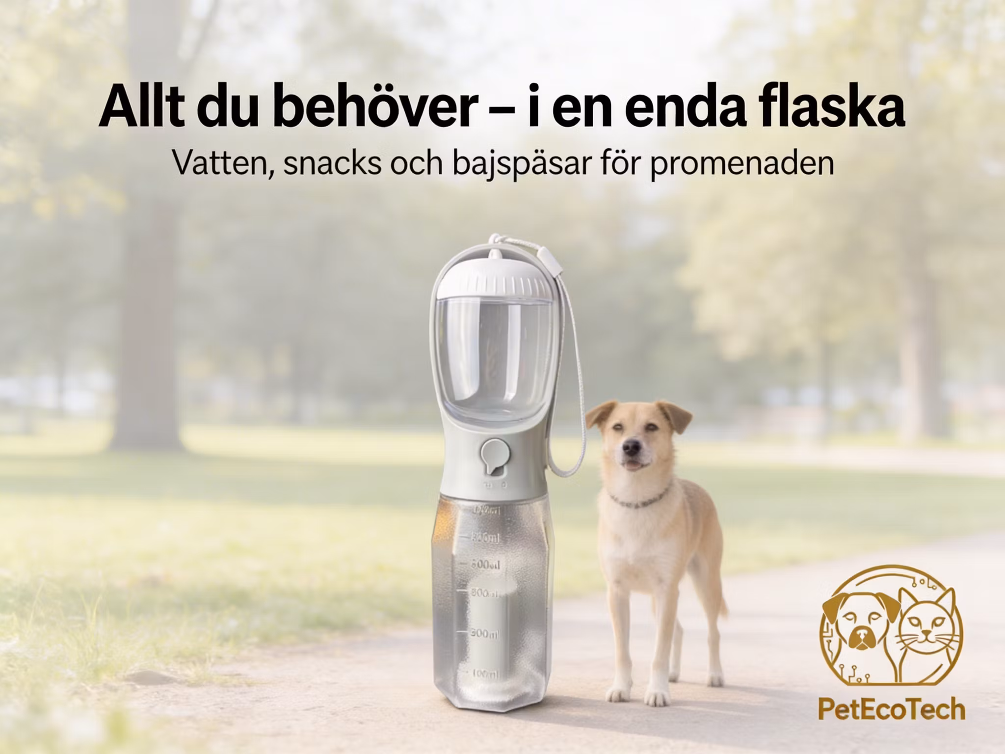 Vatten, snacks och bajspåsar i en enda stilren flaska – praktiskt, hygieniskt och redo när det behövs.